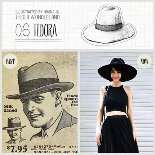 帽子上方的縱向褶痕,是這種紳士帽的特色之一,當時的男士一天要穿脫帽子30次,進入室內(nèi)要脫帽,看到淑女要脫帽,頭頂熱了要脫帽,經(jīng)過鄰居家也要打招呼脫帽。所以中間的折痕就是為了要方便紳士穿脫帽子好施力的小設(shè)計。這頂在20年代開始大受好評的帽子,近幾年經(jīng)過紐約黑幫,印第安納瓊斯和麥可杰克森的陸續(xù)加持后,仍在Fashion界有著屹立不搖的龍頭位置,堪稱帽界硬底子!